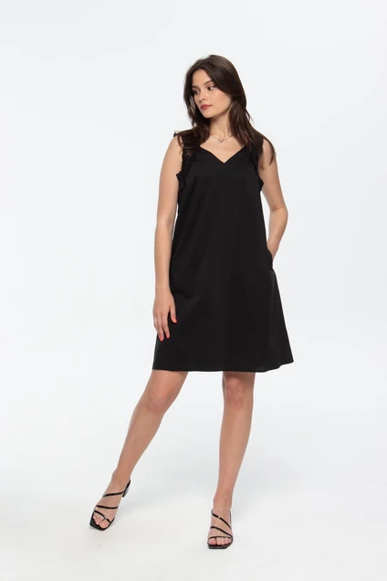 Сарафан женский ,расширенный книзу. По переду нагрудные вытачки, карманы в боковых швах, верхний срез спинки присборен на резинку. Брители с отделочной деталью в виде рюши. Длина 75 см. Рост модели 182 см.