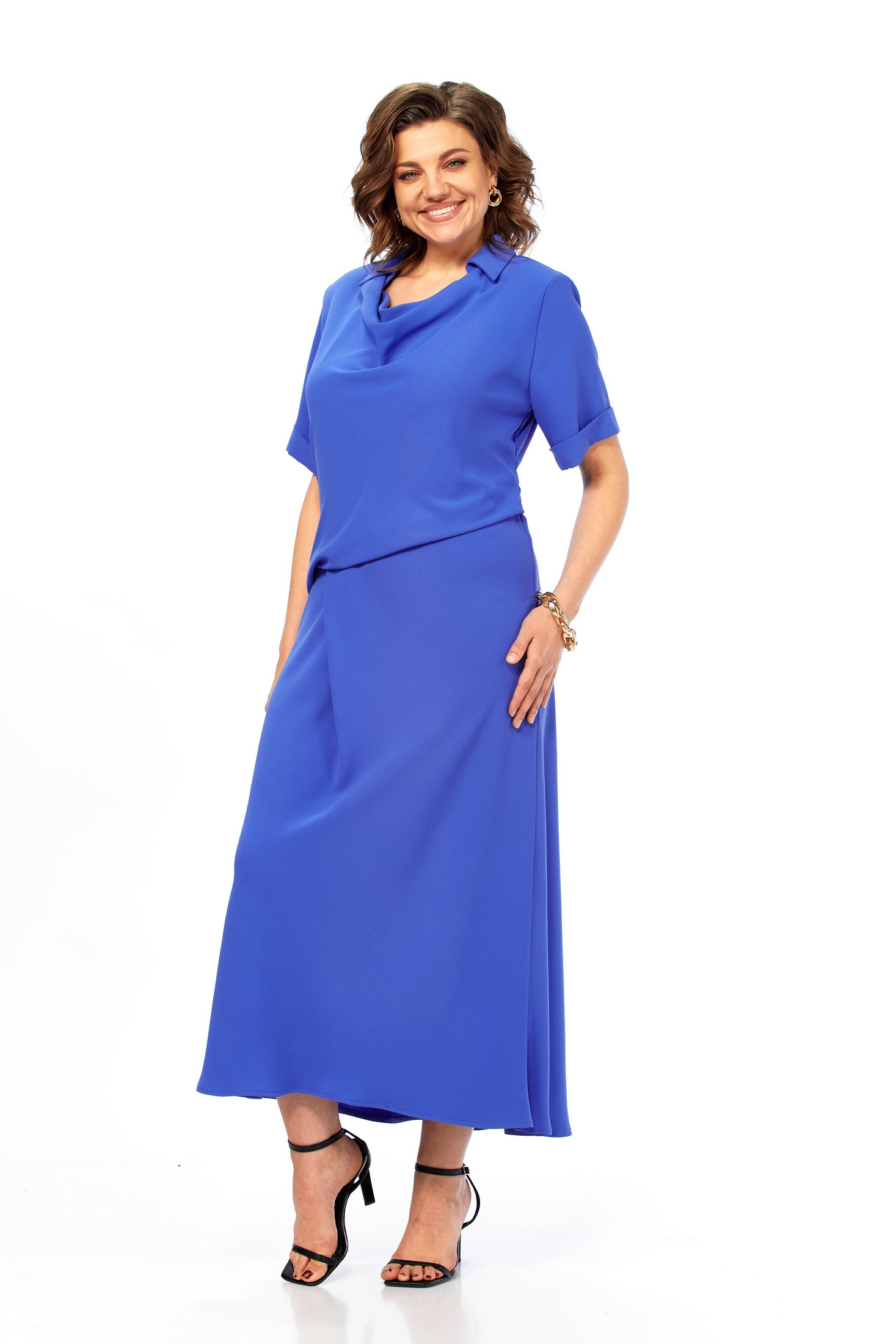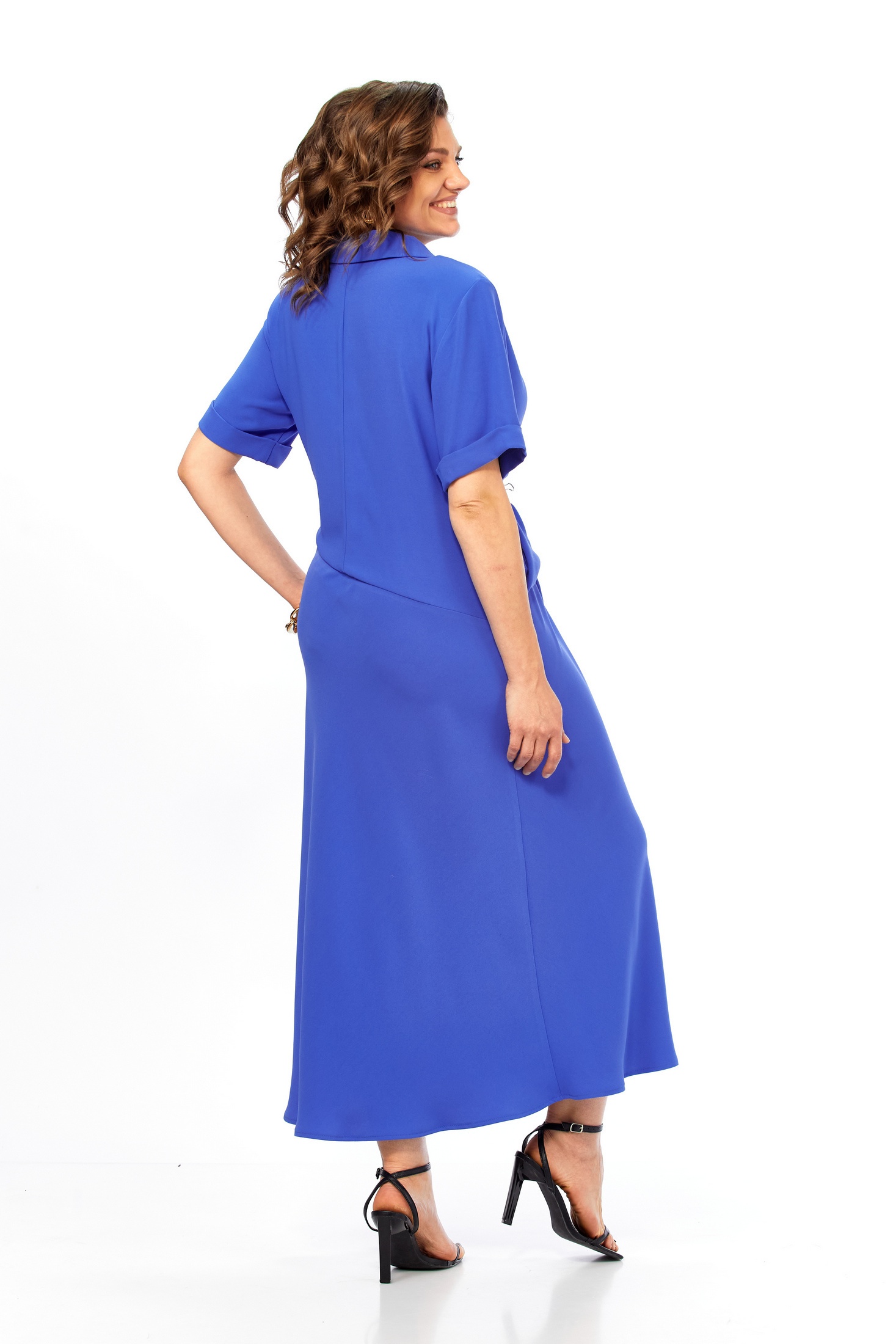 Платье 2079 синий Diamant — истинное воплощение стиля и комфорта для любого сезона. Коллекция бренда Diamant предлагает изделие, выполненное из комбинированной ткани, где вискоза создает легкость, полиэстер обеспечивает прочность, а эластан добавляет эластичности. Платье длиной до середины икры и рукавами 26 см имеет слегка расклешенный к низу фасон и стильную драпировку, придающую образу изысканности. Рубашечный воротник на стойке добавляет нотку утонченности. Синее полотно и продуманные складки делают его идеальным для работы или прогулок, создавая эффект непринужденно-элегантного образа.