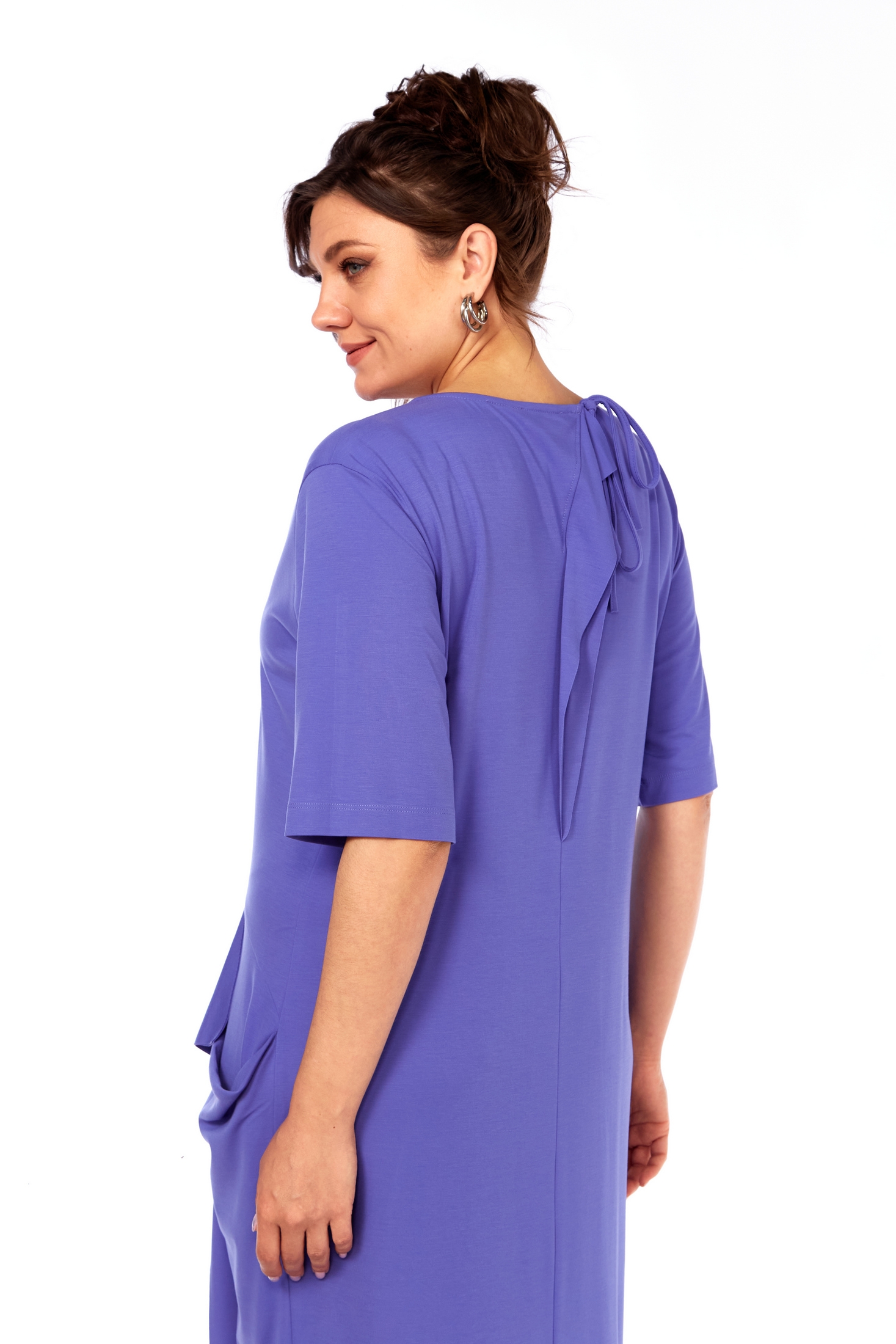 Элегантное женское платье полуприлегающего силуэта в ярко-сиреневом оттенке. Модель выполнена с рукавом 7/8 и оснащена уникальным дизайном смещённого среднего шва спереди, украшенного отлетной отделочной деталью, спускающейся до низа. На линии бедер предусмотрены подрезы с внутришовными карманами для дополнительного удобства. Вставленный рельефный шов усиливает структуру силуэта, а также добавляет утонченности. Завязка на горловине добавляет изысканность этому наряду, а длинный разрез по низу подчеркивает изящество фигуры. Удлиненная спинка с декоративной отделочной деталью до середины талии завершает образ. Это платье станет превосходным выбором для современной женщины, ценящей комфорт и стиль.