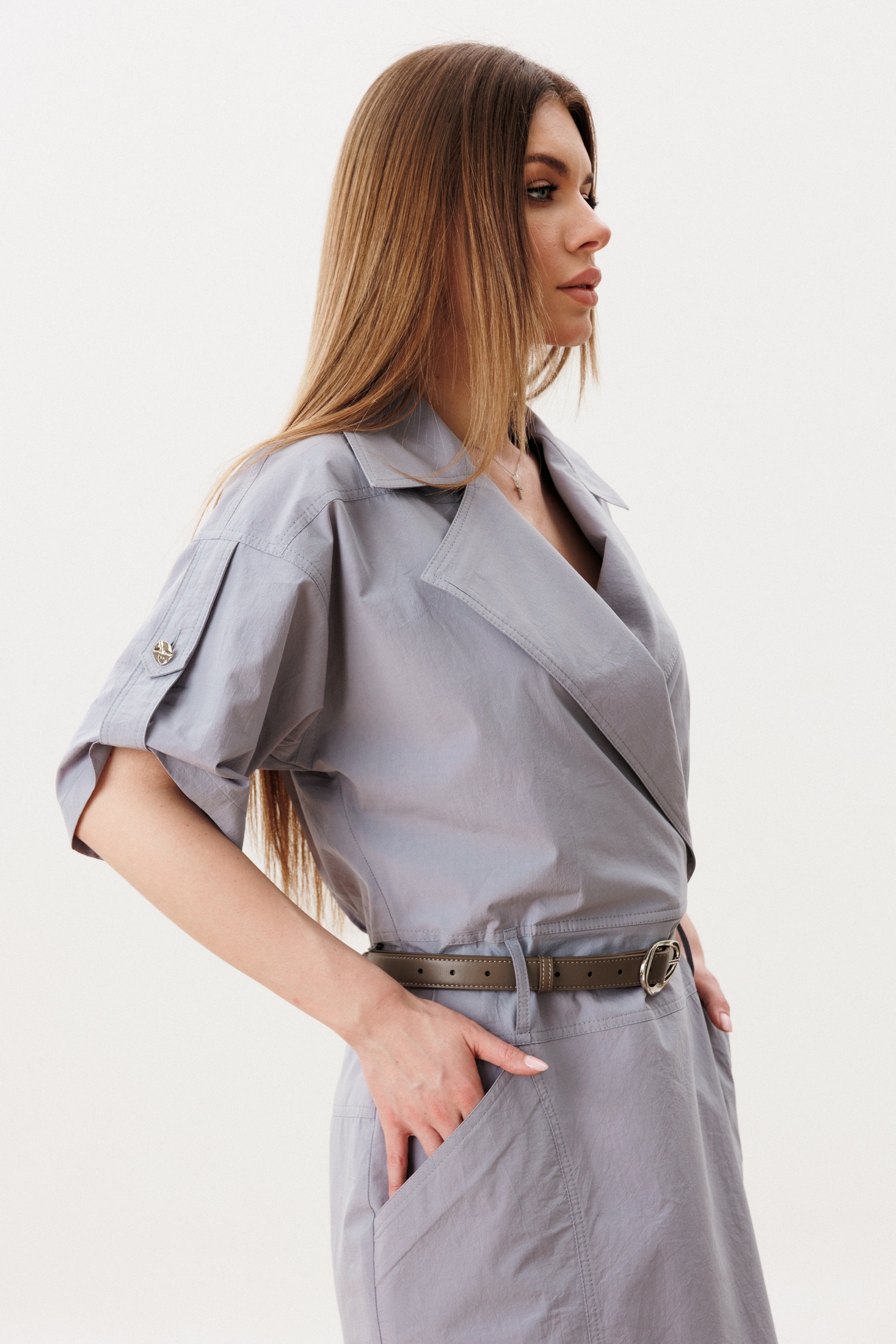 Платье 2176 серо-голубой Diamant — это стильное решение от коллекции бренда Diamant. Изготовлено из 100% хлопка, что обеспечивает комфорт и удобство в носке. Полуприлегающий силуэт с асимметричным запахом и отрезным поясом подчеркивает фигуру, а длина 94 см по спинке делает его идеальным для летнего дня. Платье оснащено удобной застежкой на молнию в левом боковом шве и карманами, что добавляет практичности. Отложной воротник с лацканами и оригинальные хлястики на рукавах с петлей и пуговицей придают изюминку образу. Рукав длиной 23 см подходит для весеннего и летнего сезона, а серо-голубой цвет легко комбинируется с различными аксессуарами и обувью.