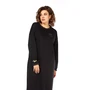 Платье женское прямого силуэта, изготовлено из трикотажного полотна. Рукава спущенные длинные. По горловине, низу рукавов и низу платья обработаны рюши из хлопковой ткани. По переду декоративная нашивка. Спинка со средним швом и разрезом по низу. В боковых швах карманы.