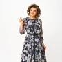 Платье женское А силуэта, на подкладке, без застежки. Перед с нагрудными вытачками. Спинка со средним швом. По низу платья пришит присобраный волан. Рукав свободный, одношовный, втачной, по окату заложена сборка, по низу присобран на эластичную тесьму в 2 ряда, образует манжету. Горловина обработана обтачкой. В дополнении пояс, застегивается на пряжку.