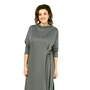 Платье женское, прямого силуэтв со спущенным длинным рукавом. Цельнокроенный воротник-стойка. Слевой стороны в области талии слева декор, в виде ниспадающего пояса. Карманы в боковых швах. Молния в левом боковом шве внизу функциональная молния, которая при растегивании превращается в разрез. Длина платья 115см, длина рукава от стойки 70см.