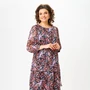 Платье женское А-образного силуэта, втачного покроя. Платье выполнено из шифона на трикотажной подкладке. Горловина округлой формы, рукава трехчетвертные со сборкой по низу, на манжету на одну пуговицу. Платье состоит из отрезных воланов по переду и по спинке повторяющих силуэт изделия. На переде расположены нагрудные вытачки. Дополнением к платью служит пояс из основной ткани, с помощью которого можно его приталить.
