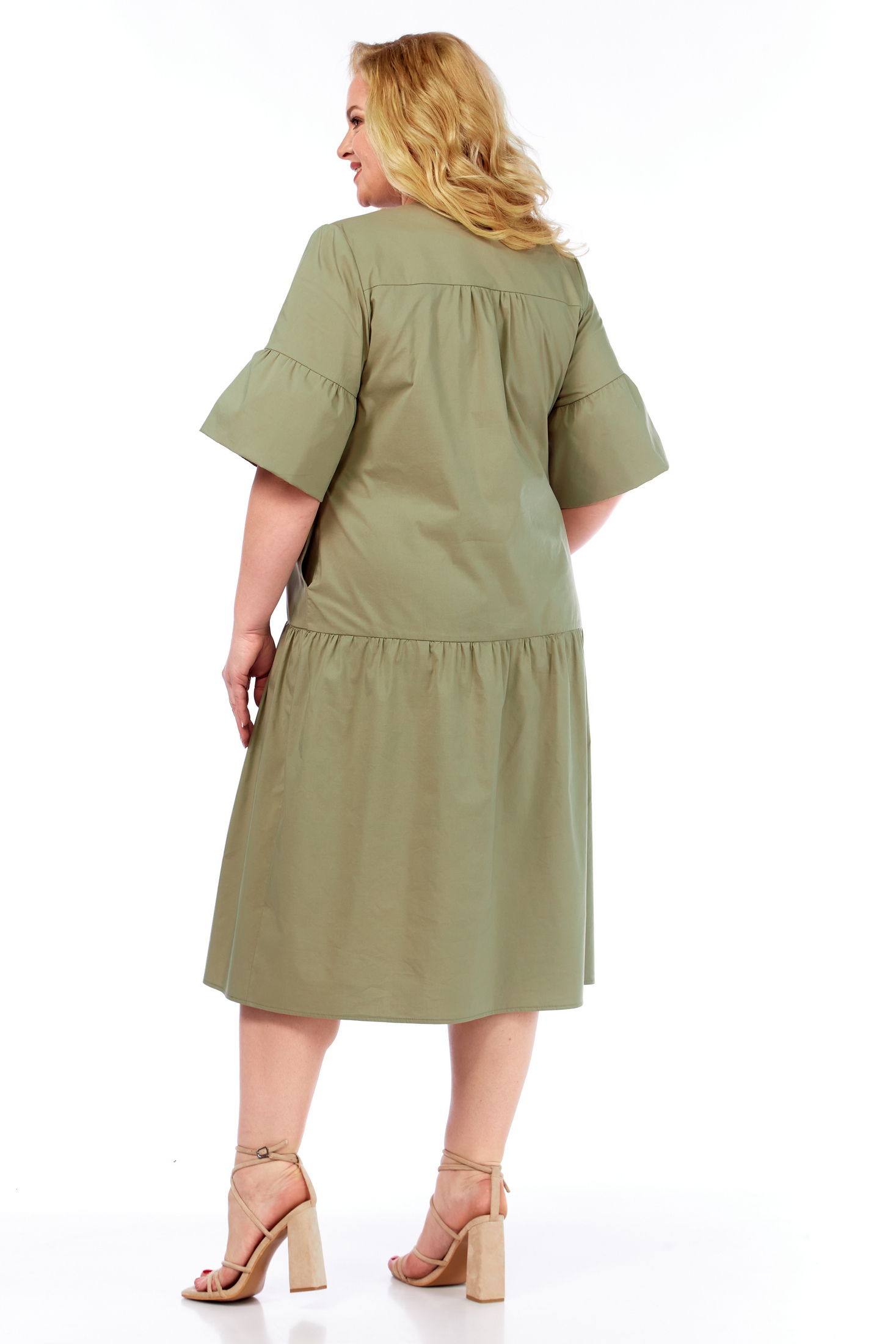 Незаменимое летнее платье на жаркие дни. Изделие полуприлегающего силуэта очень комфортное, выполнено из хлопковой ткани. По переду отрезные присборенные детали, застежка на петли и пуговицы. Вырез горловины V-образной формы. Рукав «колокол», что добавляет легкость, создает воздушность образу. В боковых швах, предусмотрены функциональные карманы.