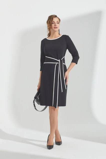 Стильное черное платье прямого силуэта, которое подойдет для для офиса или праздничного мероприятия. Платье по колено с рукавом 3/4. Горловина овальной формы с декоративным элементом белого цвета. По переду платья завязан пояс с белыми вставками, который подчеркивает талию. Позади шлица. Длина 100 см. Классическое черное платье, с интересными элементами, дополнит гардероб каждой девушки.