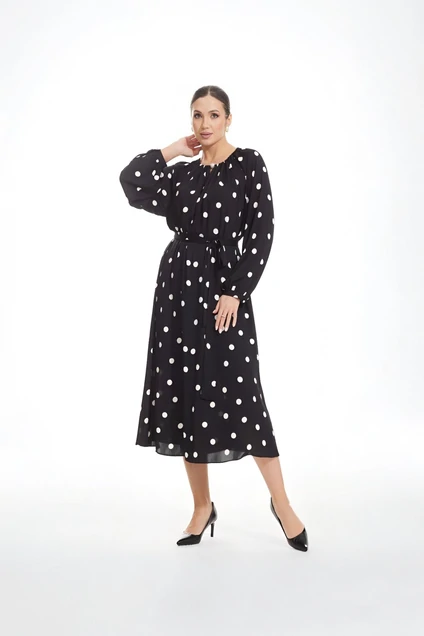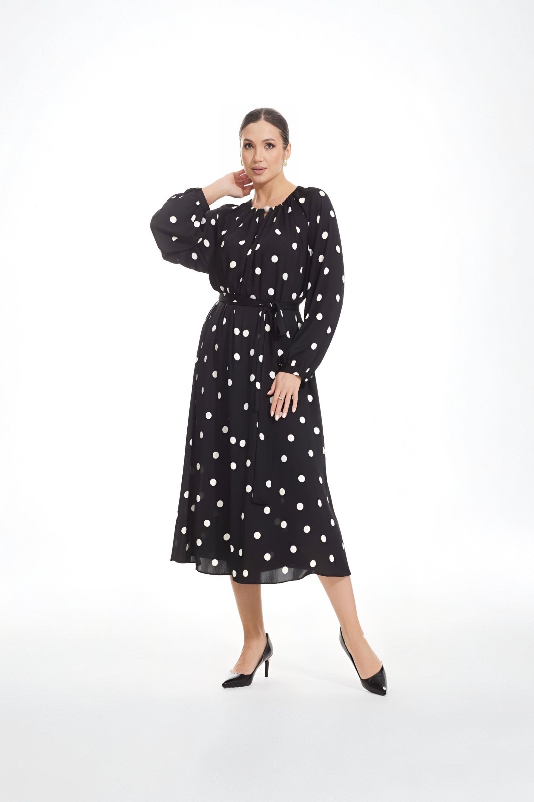 Платье 4408 Elady очаровывает своим лёгким струящимся материалом из полиэстера, способным создать непринужденный романтичный образ. Коллекция бренда Elady представляет модель свободного силуэта, которая поможет подчеркнуть вашу женственность. Декоративный пояс на талии и горловина на резинке с крупной жемчужиной добавляют изюминку. Рукав-реглан с манжетой, декорированной пуговицей, придаёт платью особый шарм. Идеально для весны и лета, это платье подходит для повседневного выхода или в качестве наряда для праздника. Черный цвет с белым горошком в дизайне смотрится стильно и современно. Длина изделия по спинке – 117 см. Длина рукава от горловины – 64 см.