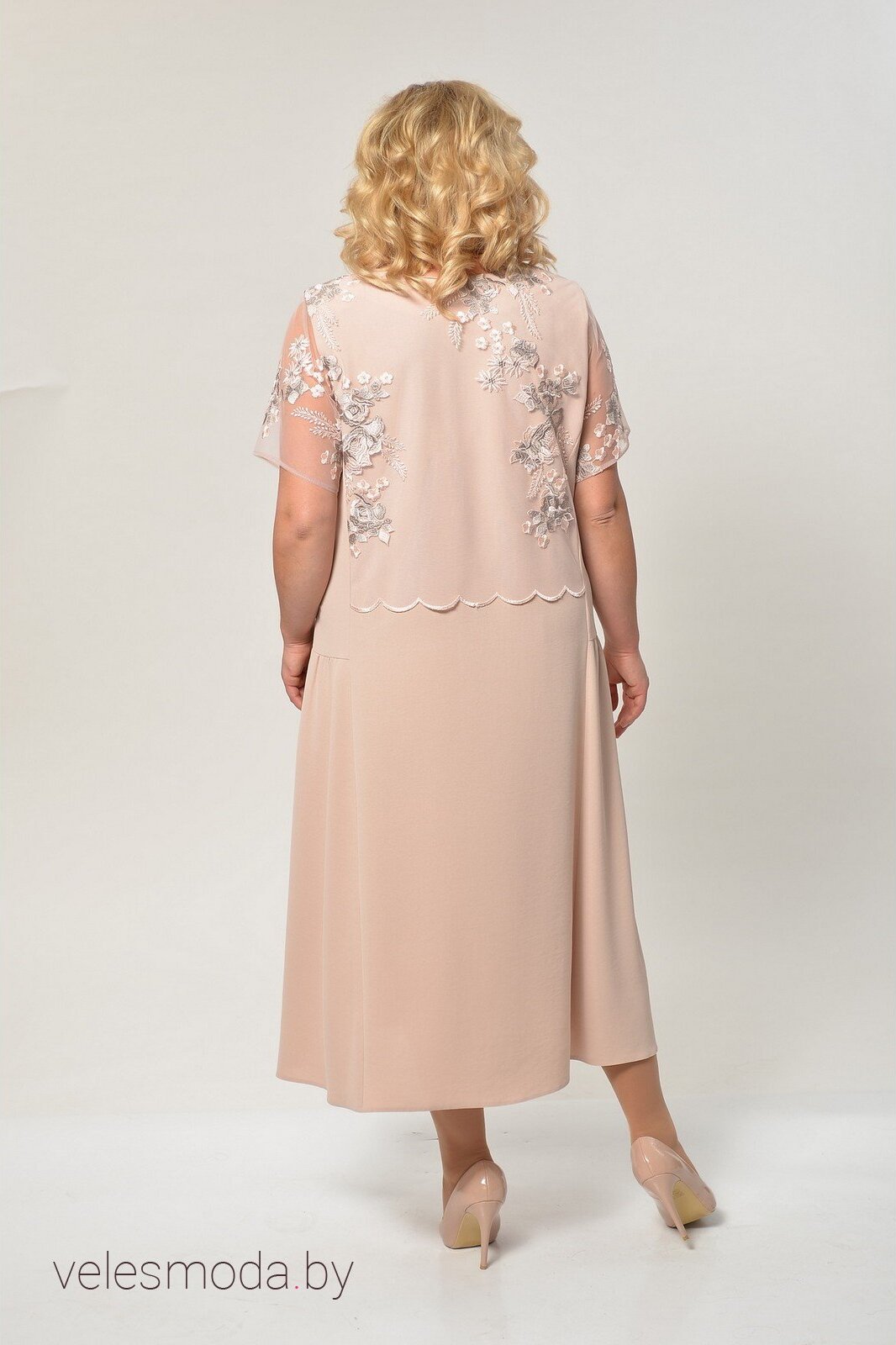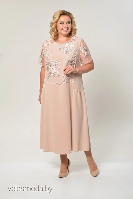 Платье из текстильной ткани. Платье свободного силуэта. Вырез горловины округлый. Перед и спинка платья с рельефными швами, идущими от пройм до низа. Верхняя часть полочки и спинки между рельефами украшены гипюром. Платье с боковыми горизонтальными подрезами на уровне бедер.По линии подрезов юбка слегка присборена. Рукав втачной одношовный из гипюра. Длина платья 123см, длина рукава 24см.
