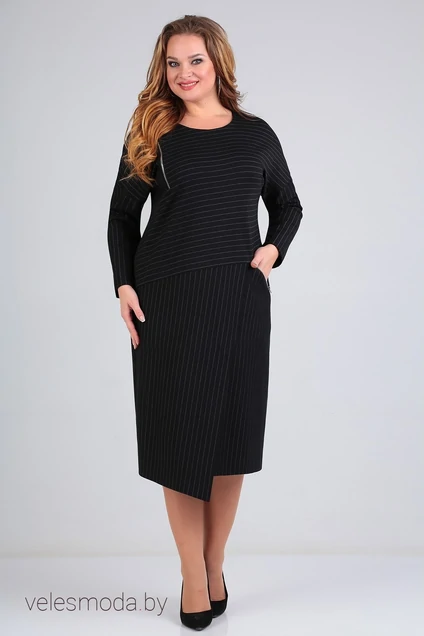 Платье полуприлегающего силуэта слегка заужено к низу. Вырез горловины округлый. Рукав втачной одношовный. Линия плеча слегка спущена. На лифе платья с одной стороны расположена фигурная кокетка со вставкой декоративной молнии. По переду платья ниже линии талии проходит горизонтальный наклонный подрез, под которым расположен косой карман с застежкой на молнию. На юбке платья есть вертикальный ассиметричный наклонный подрез, заканчивающийся шлицей с углом чуть длиннее основного платья. Спинка с потайной молнией в среднем шве. Длина платья 112см, длина рукава от выреза горловины 68см.