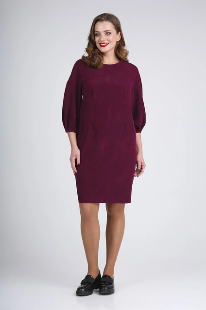 Платье из штрокса полуприлегающего силуэта. Полочка со средним швом и вертикальными талиевыми вытачками-защипами. Нагрудные вытачки идут от пройм рукавов. Спинка с потайной молнией в среднем шве и такими же вертикальными вытачками-защипами. Вырез горловины округлый. Рукав одношовный реглан с плечевой вытачкой. Расширение внизу рукава собрано в мягкие складки. Горловина и низ рукавов окантованы. В боковых швах платья - карманы. Длина платья 100см , длина рукава от выреза горловины 58см.