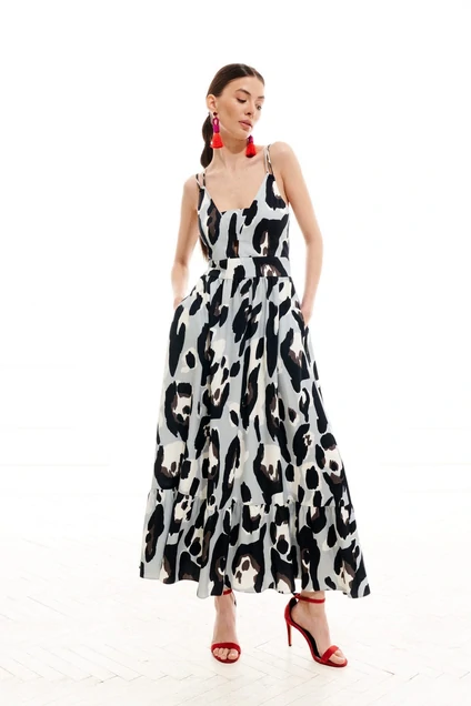 Сарафан женский, приталенного силуэта, длиной макси из плательно-блузочной ткани. Сарафан с отрезным поясом. Лиф переда и спинки с талиевыми вытачками. Лиф с отделочным элементом. Спинка со средним швом, в шве которого застежка на потайную молнию. Юбка сарафана с отрезным воланом и сборкой по талии. В боковых швах функциональные карманы. Сарафан на тонких регулируемых бретелях - завязках. Длина изделия от чаши 125 см.