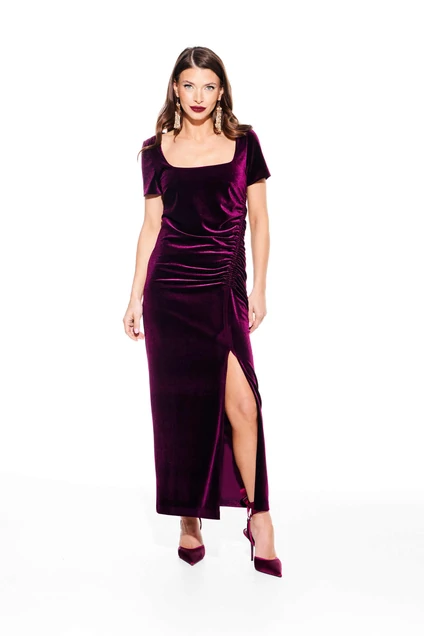 Элегантное длинное платье из бархата на трикотажной основе насыщенного бордового цвета. Модель полуприлегающего силуэта подчеркивает фигуру. Особенностью дизайна является фигурный вырез горловины и рельеф со сборкой на резинку, создающий акцент на талии. По переду нагрудные вытачки добавляют изделию аккуратный объем. Рукав втачной, короткий, что придает платью легкость. Спинка выполнена цельной, без швов, что обеспечивает идеальное прилегание. Длина платья до щиколотки, и его украшает элегантный разрез, который добавляет образу изящества и женственности.