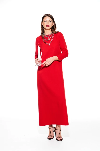 Элегантное красное платье длиной до щиколоток, выполнено из костюмно-плательной ткани. Этот прямой силуэт добавляет изысканности всему образу, умеренный объем делает его идеальным выбором для различных мероприятий. Фасон платья предусматривает круглый вырез горловины на передней части и уникальный V-образный вырез на спине, что придает изделию особый шарм. Дизайн дополнен потайной молнией в среднем шве спинки для удобства надевания. Рукава длиной 3/4 и нагрудные вытачки добавляют структурированности и подчеркивают фигуру. Воланы, украшающие вырез горловины и средний шов на спине, придают роскошный и женственный акцент всему составу.