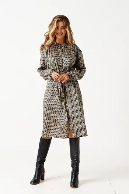 Платье женское, свободного силуэта, длиной ниже линии колен, из текстильной ткани. Перед с отрезными кокетками , отрезными планками, застежкой на пуговицы. Спинка с отрезной кокеткой на уровне лопаток. Вырез горловины обработан воротником -стойкой. Рукав втачной, одношовный, по низу обработан притачной манжетой. Платье на отлетной подкладке-комбинация. В комплекте пояс из основной ткани. Длина 114 см, рукав от горловины - 74 см