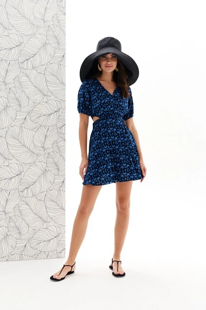 Платье женское, приталенного силуэта, длиной выше линии колен из плательно-блузочной ткани. Отрезное по линии талии, подрез талии фигурный. Перед лифа со средним швом и складками. Лиф платья частично соединен с юбкой, боковые части лифа и юбки на резинке для лучшего прилегания. Спинка со средним швом и застежкой на потайную молнию в шве. Рукав короткий, втачной, низ рукава собран на резинку. Горловина переда V-образная, горловина спинки - круглая. Длина 84 см, рукав 25 см.