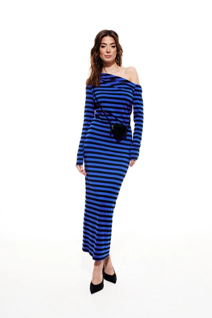 Платье женское, приталенного силуэта, длиной макси из трикотажного полотна. С правого плеча в левый направлена драпировка - складки. Правый рукав одношовный, втачной, длинный. Левый рукав длинный, спущенный с линии плеча, сверху на резинке. Вырез горловины обработан широкой обтачкой. Длина 140 см, рукав 61,5 см.