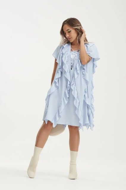 Платье женское, А-силуэта. По переду и спинке подрезы с воланами. Крайний волан имитирует рукав. По переду глубокая V-образная горловина со шнуровкой, что позволяет регулировать форму выреза горловины. В комплекте бандо выполненое из трикотажного полотна, с резинками.