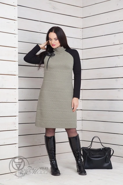 Платье женское, А-силуэта, рукав покроя реглан. Воротник стойка, в боковых швах карманы. Перед декорирован украшением.