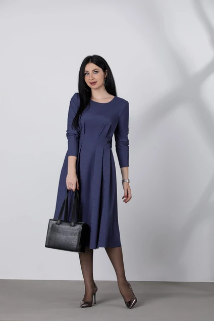 Платье женское. Прилегающий силуэт создаётся с помощью складок и пат по линии талии, переда и спинки. Паты с петлями и пуговицами, позволяют регулировать ширину талии. Рукав втачной, в боковых швах карманы.
