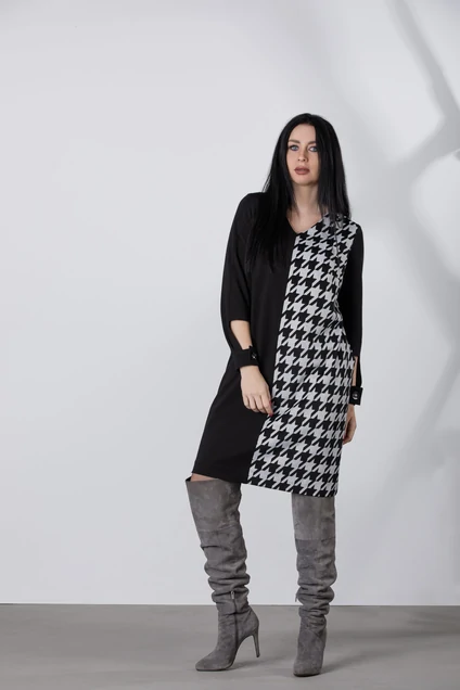 Платье женское, прямого, слегка расширенного к низу силуэта. Платье выполнено из двух видов трикотажных полотен. Рукав втачной, с рельефом и фигурным вырезом, который позволяет показать запястье. По низу рукава притачная манжета. Горловина V-образная. В комплект съемный двухсторонний воротник- хомут.