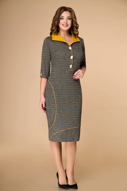 Платье женское полуприлегающего силуэта. По переду застежка на петли и пуговицы. Рукав втачной 3/4. Пуговицы на руковах являются элементами декора. Длина готового изделия 109 см +/-1см. Длина рукава 39 см +/-1см.