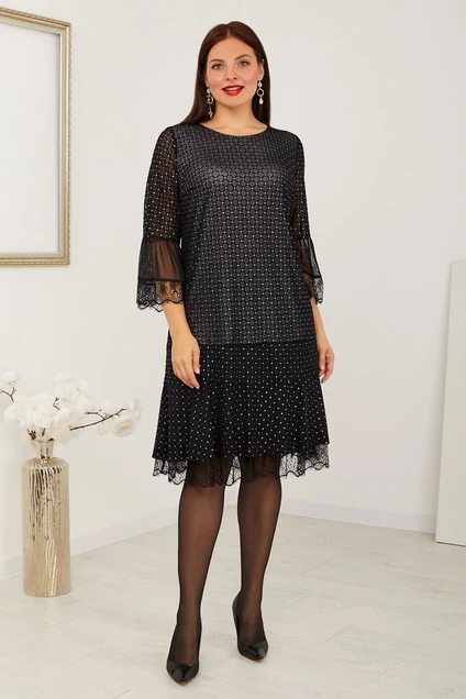 Двухслойное платье длиной чуть ниже колена выполнено из нарядных тканей. Слегка расклешонный силуэт, по низу двойной волан. На нижний настрочено кружево с бахромой. По рукаву - волан из простой сетки с кружевом. Горловина округлая. Нижнее платье - из блестящего трикотажного полотна. Замеры платья в 52размере: Длина по спинке - 96 см, Полуобхват по груди - 58см; Полуобхват по бёдрам - 61 см; Ширина рукава под проймой - полуобхват 20 см, Длина рукава -49-50 см.