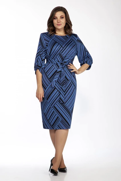 Платье из трикотажного полотна, геометрического рисунка, полуприлегающего силуэта. По переду нагрудные вытачки выходящие из бокового шва. Горловина округлой формы, на обтачке. Спинка с талиевыми вытачками. Рукав втачной, 3/4 длина, одношовный. Рукав формы "фонарик" по низу имеет мягкие складки, обработан притачной фигурной манжетой. К платью прилагается съемный пояс из основной ткани.