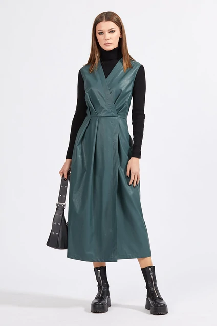 Сарафан выполнен из экокожи. Сарафан Х-образного силуэта, отрезной по линии талии, длиной миди. Спереди имитация запаха. Вырез горловины V-образной формы. Застежка на потайную тесьму-молнию в среднем шве спинки. Плечевой шов заужен. Юбка слегка расширена к низу. В боковых швах карманы.