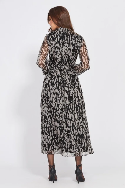 Платье выполнено из плательно-блузочной ткани с принтом. Платье отрезное по линии талии. Воротник рубашечного типа. Застежка спереди на пуговицы на планке. Рукав втачной, на манжете. Лиф и юбка платья на подкладке. Ремень входит в комплект.