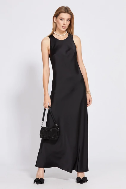 Платье выполнено из плотного атласа. Платье приталенного силуэта длиной в пол. Спинка цельная. Горловина округлой формы. Плечевой шов заужен. Платье на отлетоной по низу подкладке.