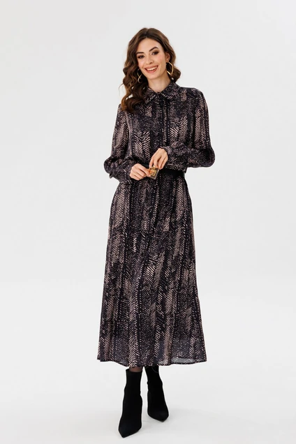 Платье выполнено из креп-атласа с принтом. Платье рубашечного силуэта, длиной миди. Застежка спереди на пуговицы. На спинке кокетка и встречная складка от нее. Воротник стояче-отложной с отрезной стойкой. Рукав втачной, одношовный, с прорезью по низу. Низ рукава на манжете, застегивающейся на пуговицы. В боковых швах карманы. Платье декорировано нашивками по спинке. Платье на отлетной по низу подкладке.