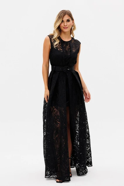 Платье выполнено из органзы с цветочным принтом. Платье Х-образного силуэта, длиной в пол. Платье отрезное по линии талии. Спереди встречная складка со сборкой по центру. Горловина округлой формы. Лиф на подкладке из атласа с V-образным вырезом. Верхняя юбка расширенная к низу со складками по переду и спинке. По центру переда разрез от талии до низа. Нижняя юбка прямого силуэта, длиной выше линии колена. В комплект входит съемный ремень из атласа.