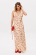 Сарафан выполнен из плательно-блузочной ткани с цветочным принтом. Сарафан полуприлегающего силуэта, длиной до линии щиколотки. Перед и спинка покроены по косой. Спереди фигурные подрезы под грудью. Горловина V-образной формы. Сарафан декорирован тесьмой-кружевом, переходящим в бретели. Лиф двойной.