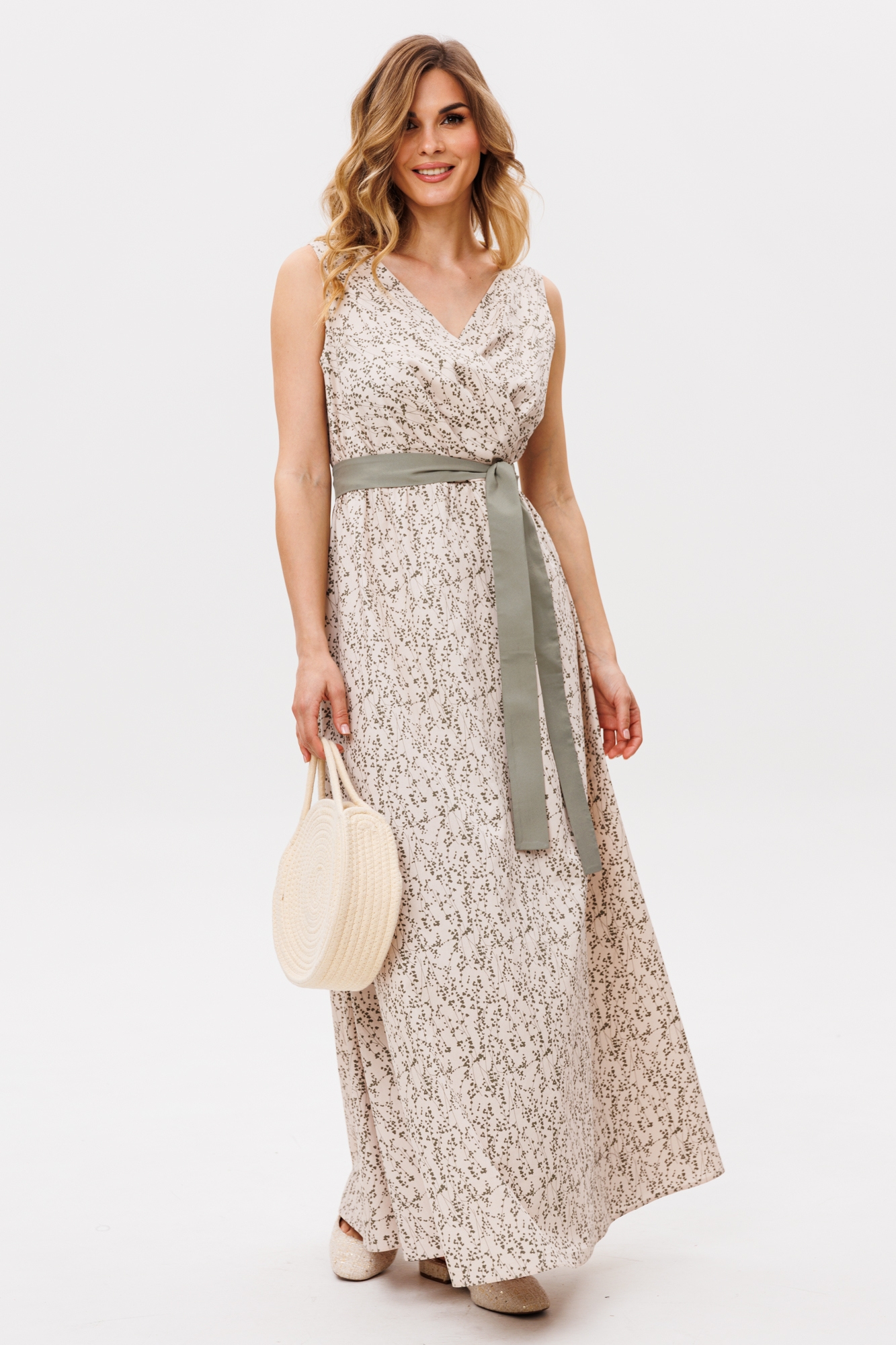 Платье выполнено из плательно-блузочной ткани. Платье Х-образного силуэта, отрезное по линии талии, длиной миди. Перед лифа выполнен "на запах" со складками по линии талии. Спинка цельная. Вырез V-образной формы. Плечевой шов заужен. Юбка расширена к низу. По линии талии вставлена эластичная тесьма. Пояс из отделочной ткани входит в комплект.