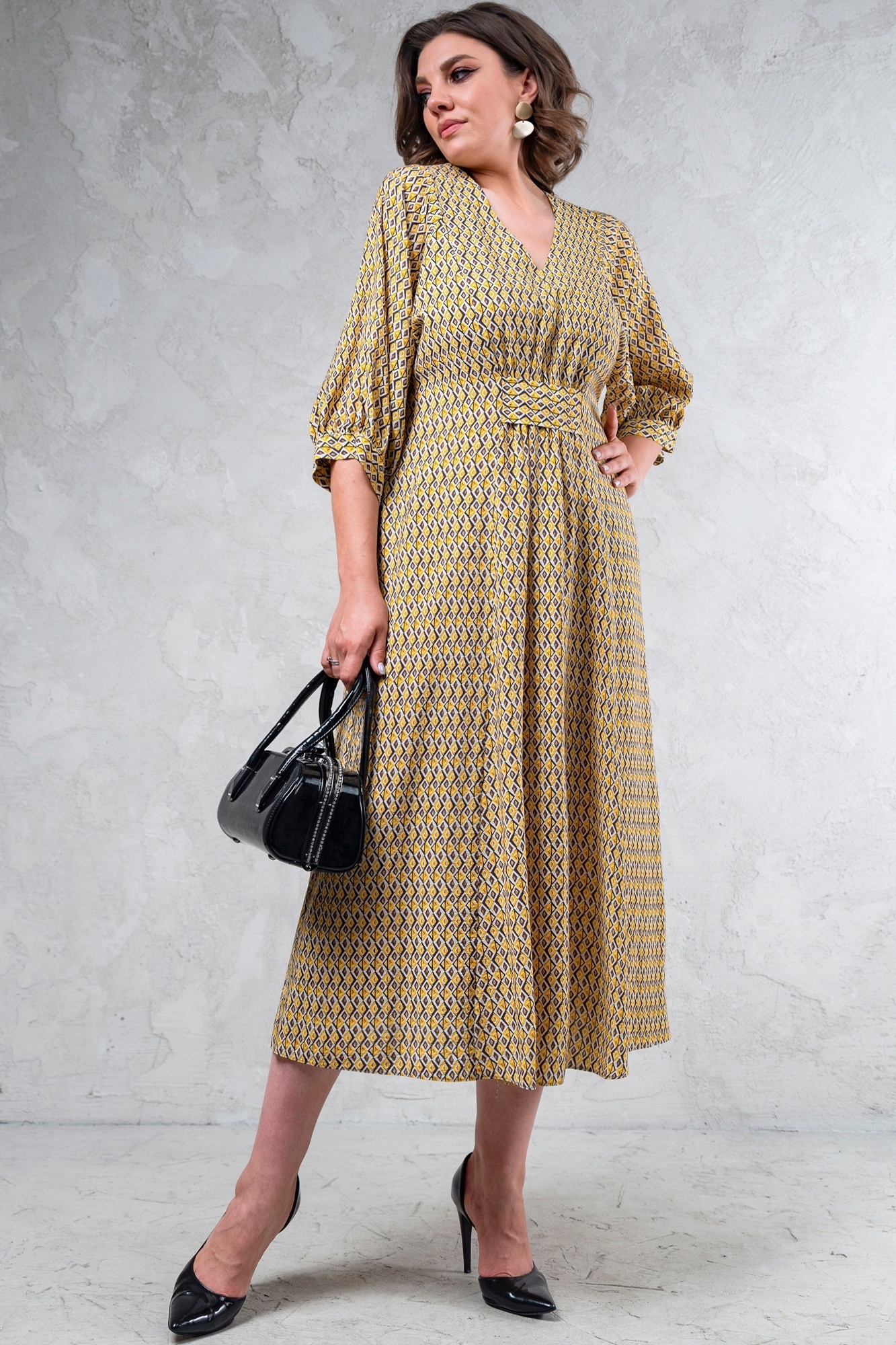 Платье полуприлегающего силуэта с V-образым вырезом. По переду сборка, перехваченная широкой полоской, что придает силуэту стройности.