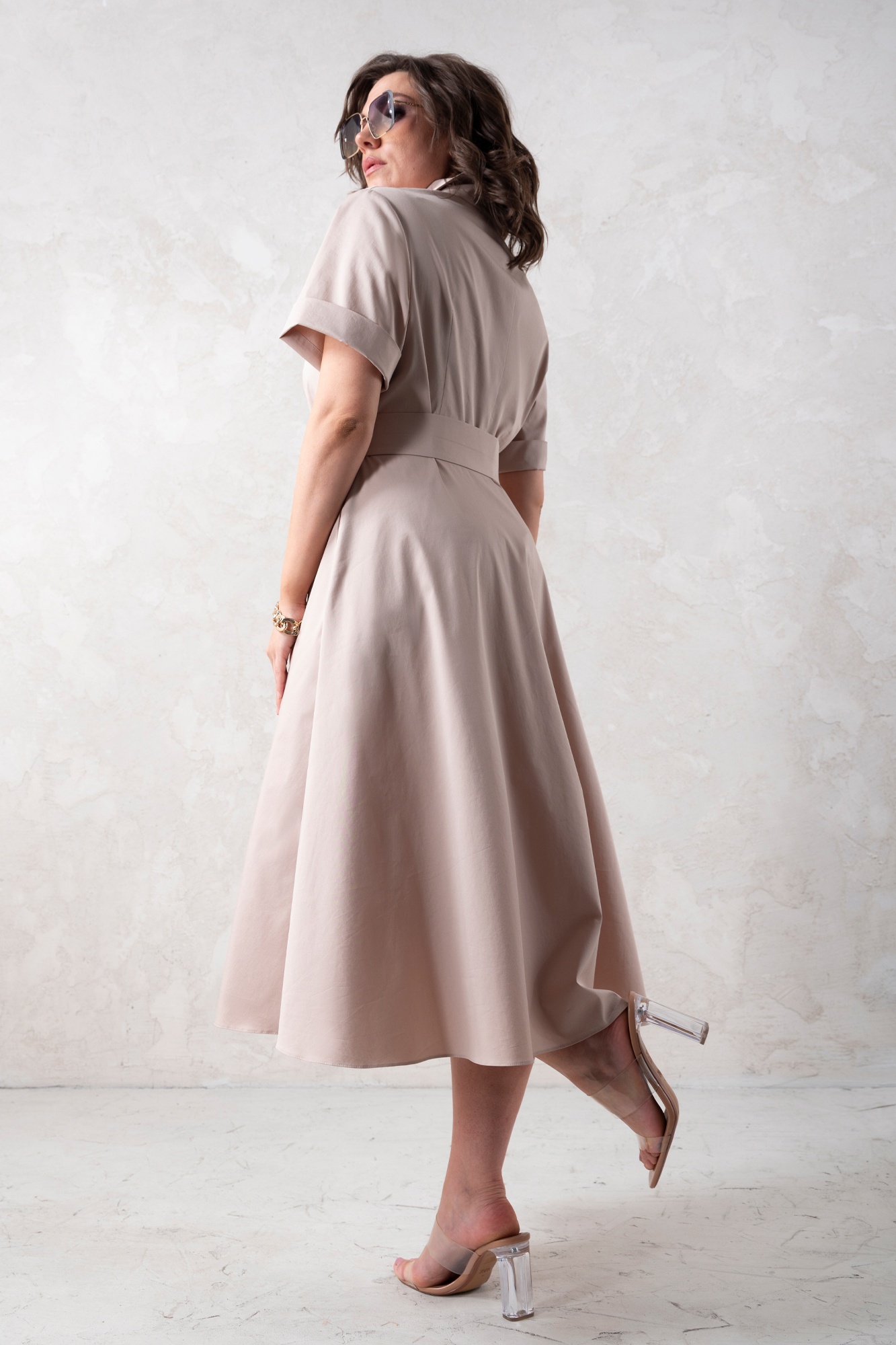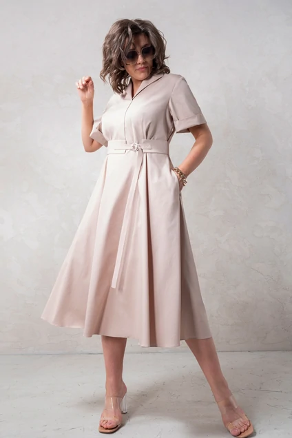 платье отрезное по линии талии с расклешенной юбкой и карманами в боковых швах. Воротник типа "апаш". Рукав втачной, короткий. Застежка на потайную молнию в боковом шве. Платье дополнено оригинальным поясом.