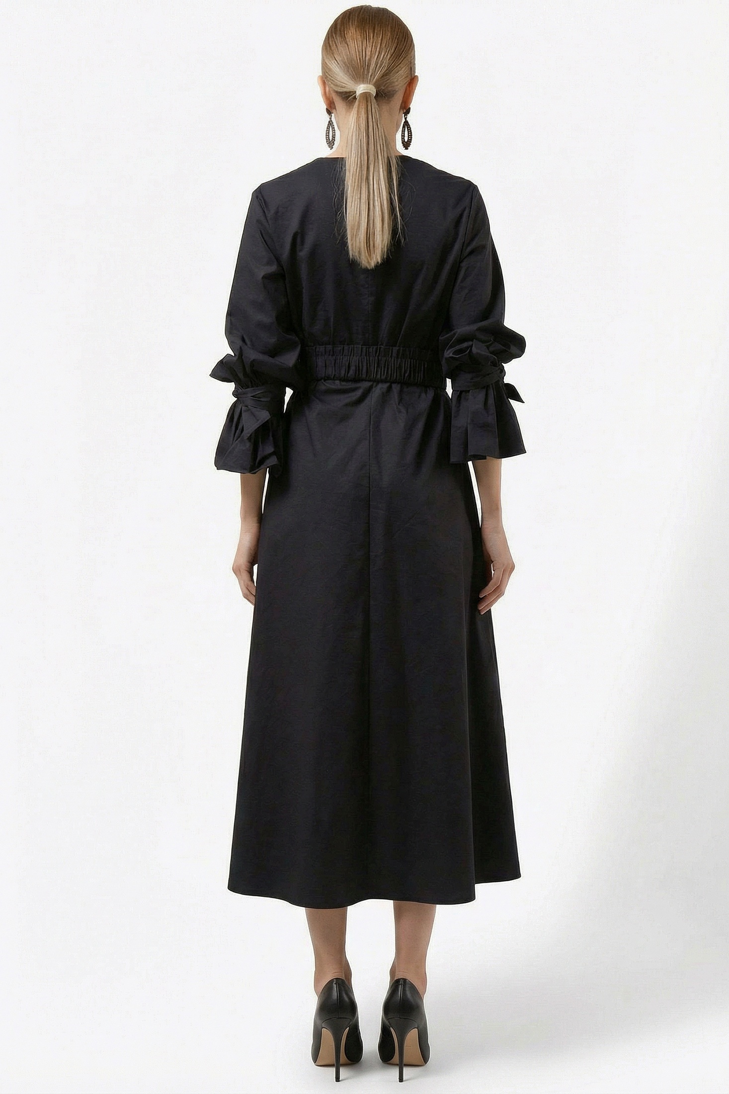Платье 7218 черный от коллекции бренда Erika — это элегантное миди, выполненное из 100% хлопка. Ткань добавляет легкий блеск, который придаёт образу утончённость. V-образный вырез и дизайнерские объемные рукава с манжетами обеспечивают романтичный и оригинальный вид. Платье подчёркивает талию благодаря широкой эластичной вставке с декоративной пряжкой, а свободная юбка расширяется для комфорта и свободы движения. Это идеальный выбор для весны и осени, который подходит как для ежедневного ношения, так и для работы. Черный цвет добавляет универсальности и стиля.
