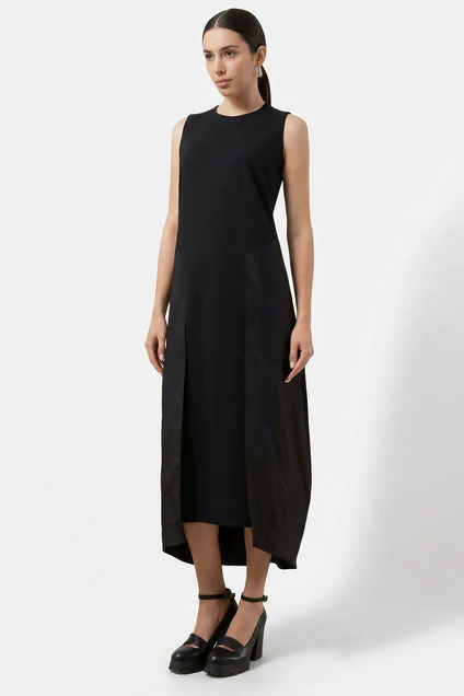 Платье 7234 черный Erika придаст элегантный акцент вашему образу. Коллекция бренда Erika предлагает это платье, выполненное из мягкого и легкого материала с преобладанием вискозы, что гарантирует комфорт в носке. Приталенный силуэт и асимметричный подол придают модели современный вид. Черный цвет добавляет изделию универсальности, идеально подходящий как для офиса, так и для вечернего выхода. Это платье миди без рукавов станет отличным выбором для осенне-весеннего сезона.