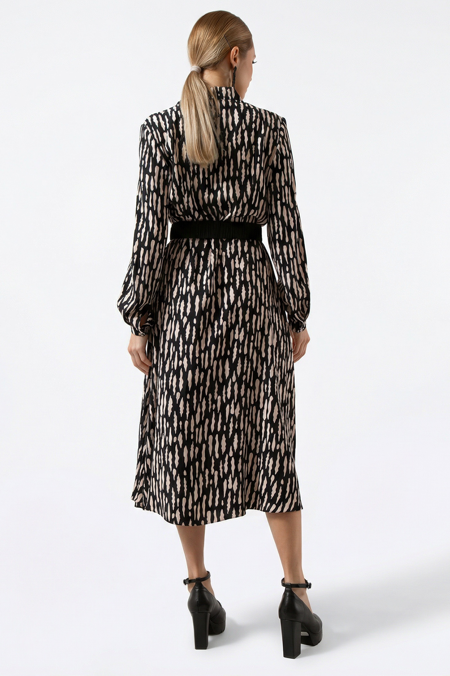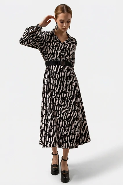 Платье 7235 Erika из коллекции бренда Erika сочетает в себе легкость и элегантность. Изготовлено из мягкой ткани с составом 82% вискоза и 18% хлопок, что гарантирует комфорт в каждодневной носке. Миди длина и приталенный крой подчеркивают женственность, а широкий черный ремень акцентирует талию. Оригинальный абстрактный принт в черно-белой гамме добавляет уникальности. Длинные рукава на манжетах и классический воротник делают это платье отличным выбором как для повседневного образа, так и для особых случаев в весенне-летний сезон.