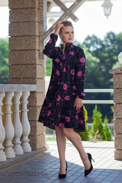 Платье женское выполнено из плательной ткани полуприлегающее в облсти груди. Изделие отрезное с расширяющимися к низу воланами, перед немного короче спинки. Воротник- стойка, по полочке располежена планка с застежкой петля-пуговица и нагрудные выточки. Рукав втачной с плечевой накладкой расширенный с эластичной тесьмой по низу. длина изделия 95см по переду.