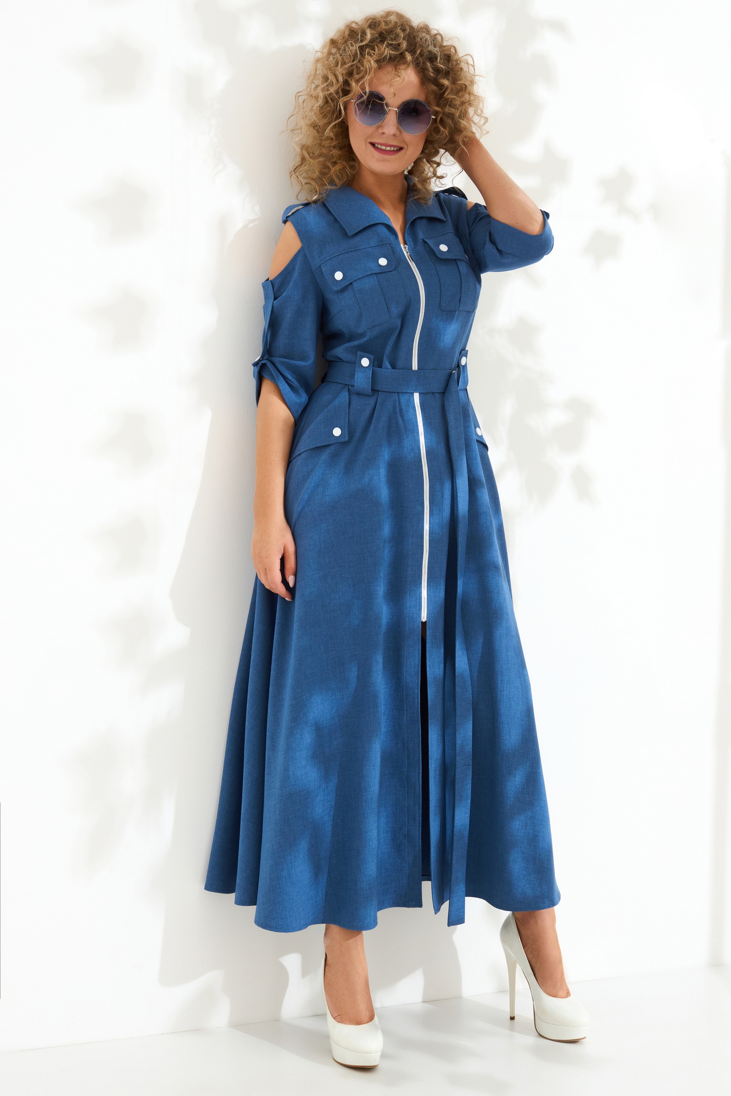 Платье 690 синий Euro Moda – это стильное изделие из коллекции бренда Euro Moda. Изготовлено из плотного льна-вишера, оно подчеркивает фигуру благодаря полуприлегающему силуэту. Воротник-стойка и втачные рукава 3/4 с декоративными патами добавляют изысканности. Изделие отрезное по линии талии и дополнено функциональными карманами с клапаном. Юбка А-силуэта и застежка-молния добавляют удобства и стильного шика. Идеально подойдет для тёплой весны или летних вечеров, на работу или прогулку. Синий цвет придаёт свежести вашему образу.