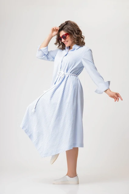 Платье-рубашка свободного силуэта. Центральная застежка потайная на пуговицах. В боковых швах карманы. Платье ассиметричное- одна из полочек выполнена углом. Рукав длинный с манжетом. Воротник рубашечный. Завязывается на декоративный пояс- шнур.