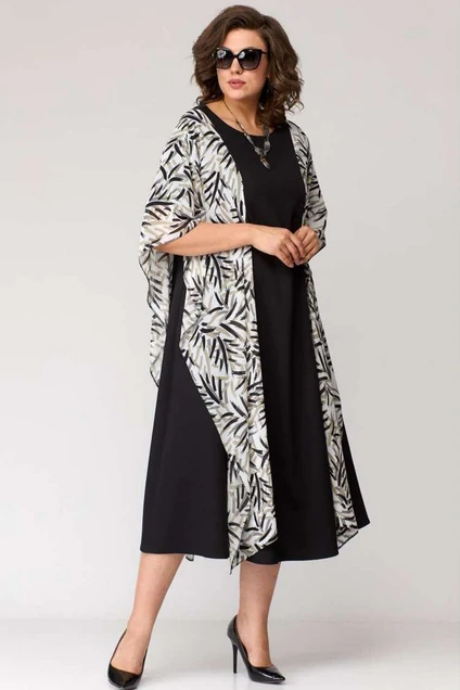 Платье женское нарядное свободного силуэта выполнено в сочетании 2-х тканей - текстильного полотна и цветного шифона. Вырез горловины круглый обработан обтачкой, по спинке застежка на одну навесную петлю и пуговицу. По платью две детали из шифона по спинке и полочке создают имитацию рукава "фентези". Платье удлененное расширенное к низу. Декором служит принт на шифлоне.