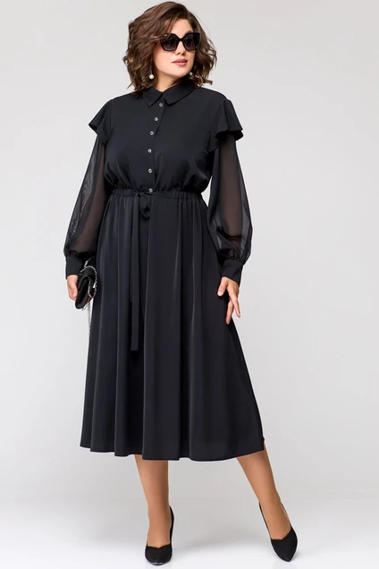 Платье женское нарядно-повседневное, выполнено из плательной ткани в сочетании с шифоном. Вырез горловины воротник на стойке, рукав втачной из шифона на притачной манжете, по пройме рукава вставлено крылышко из основной ткани. Платье отрезное по талии с притачной кулисой через которую протянут пояс с резинкой. До талии притачная планка-застежка на обметанные петли и пуговицы. Декором служат отделочные пуговицы.