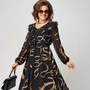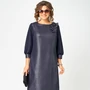 Платье женское повседневное полуприлегающего силуэта с фигурным низом расширенное к низу, выполнено из плательной ткани. Вырез горловины воротник «стойка», рукав втачной 7/8 по низу на притачной манжете собран на сборку. В рукаве отделочная пата которой можно регулировать длину рукава и делать короче. В боковых швах обработаны карманы и разрезы . По переду застежка до талии на обметанные петли и три отделочных пуговицы, по спинке фигурная кокетка и встречная складка. Платье расширено к низу за счет складок по переду. Декором служит отделочная нашивка по спинке и декоративные пуговицы по переду и рукавам.