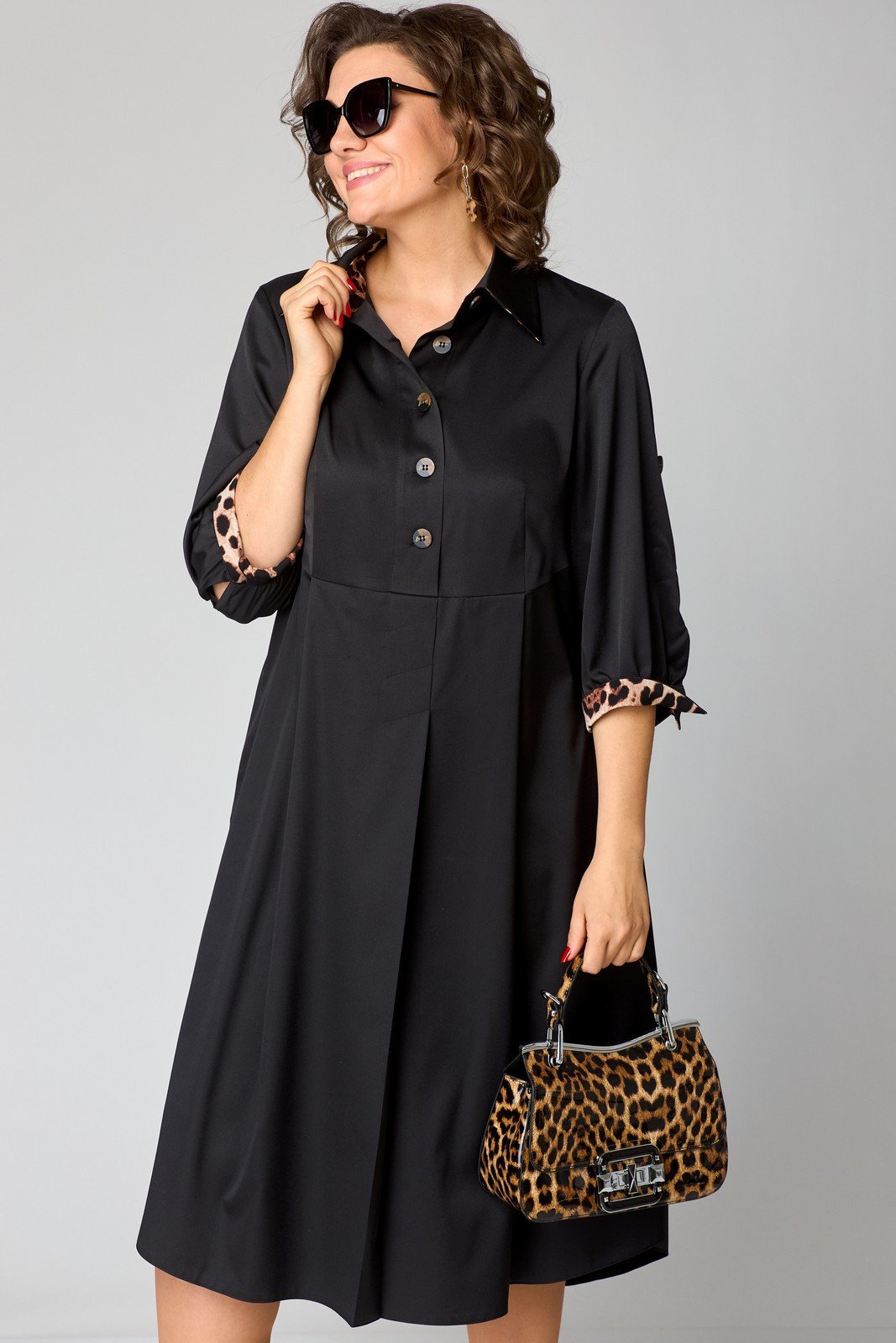 Платье женское повседневное полуприлегающего силуэта с фигурным низом расширенное к низу, выполнено из плательной ткани в сочетании с отделкой с принтом леопард. Вырез горловины воротник «стойка», рукав втачной 7/8 по низу на притачной манжете собран на сборку. В рукаве отделочная пата которой можно регулировать длину рукава и делать короче. В боковых швах обработаны карманы и разрезы . По переду застежка до талии на обметанные петли и три отделочных пуговицы, по спинке фигурная кокетка и встречная складка. Платье расширено к низу за счет складок по переду. Декором служит отделочнй принт в манжетах и стойке воротника.