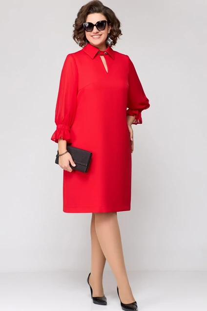 Платье женское нарядно-повседневное А-силуэта выполнено из плательной ткани в сочетании с шифоном. Вырез горловины - воротник на стойке рубашечного типа. По центру переда отделочный элемент в виде "капельки" зафиксированный патой с отделочными пуговицами. Пата съемная. Рукав втачной 7/8 из шифона по низу с воланом. В боковых швах обработаны карманы. Декором платья служат отделочные пуговицы со стразами.