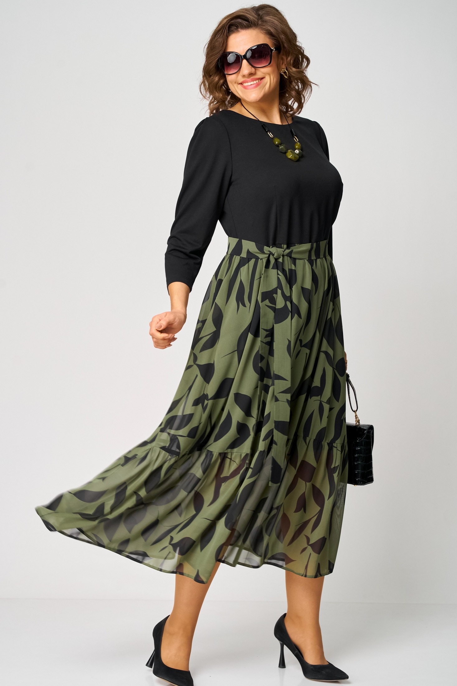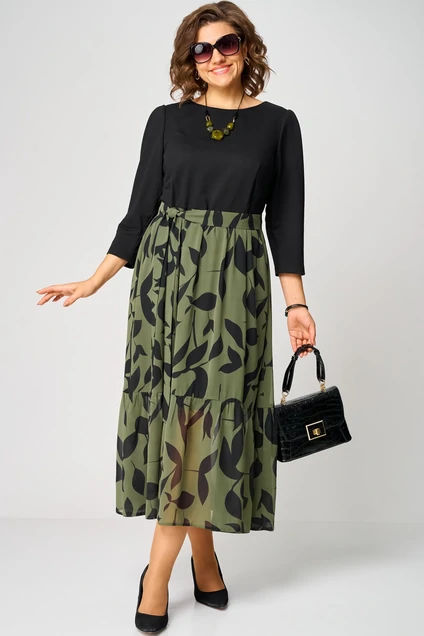 Платье 7216С принт олива EVA GRANT — идеальный выбор для создания элегантного образа. Коллекция бренда EVA GRANT предлагает вам это платье, выполненное из комбинации трикотажа и шифона, что обеспечивает комфорт и легкость. Фасон полуприлегающий, с отрезной талией, акцентированной съемным поясом в тон юбке. Классический круглый вырез на обтачке и застежка-капелька на спинке подчеркивают стиль. Длина миди придает платью универсальность, а сложный принт на юбке делает его отличным для повседневных и нарядных мероприятий. Рукава 7/8 со встречными складками добавляют оригинальности. Оливково-черная цветовая гамма подходит для осенне-зимнего сезона и создает изысканный образ для работы или вечеринки.