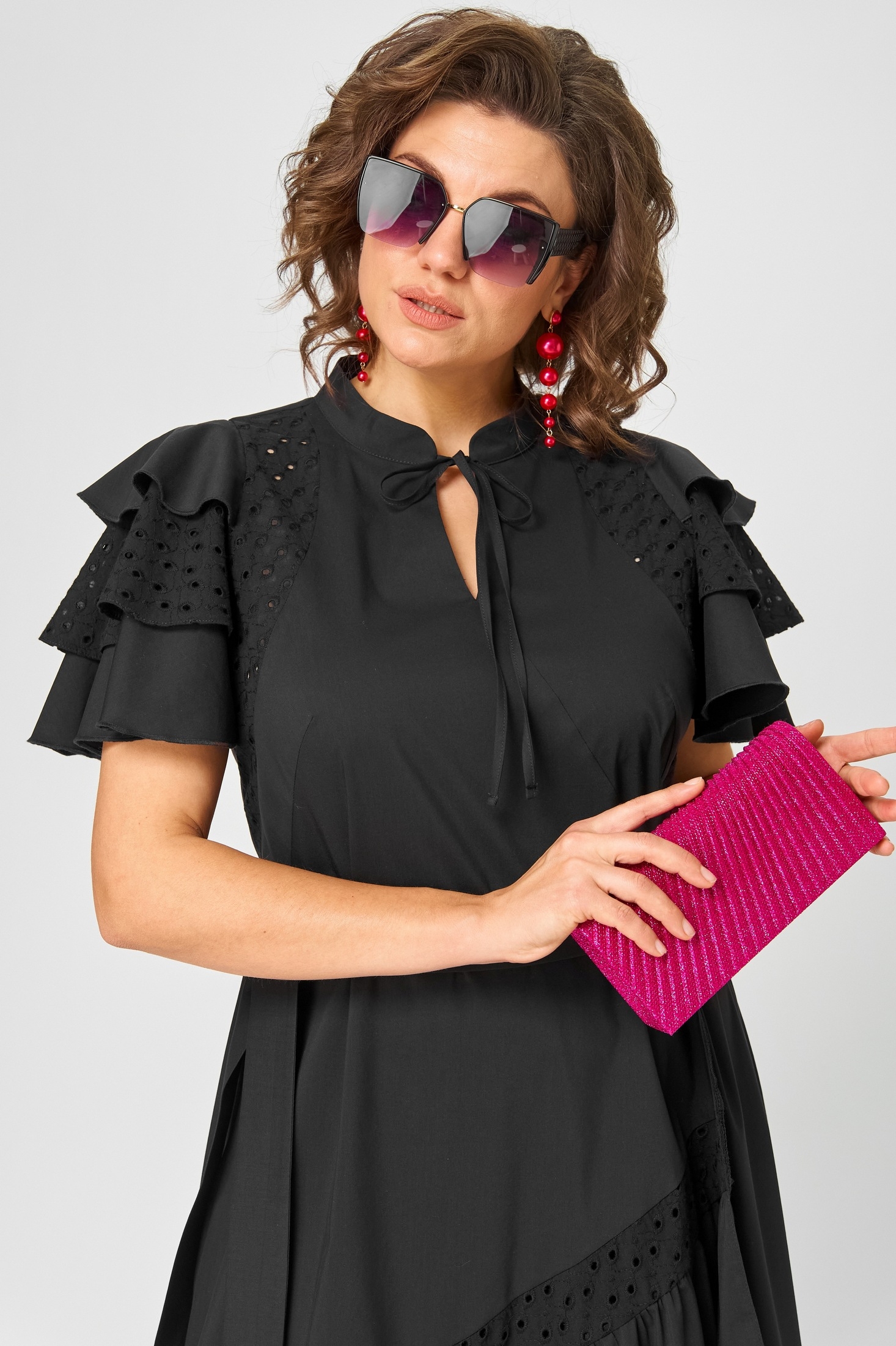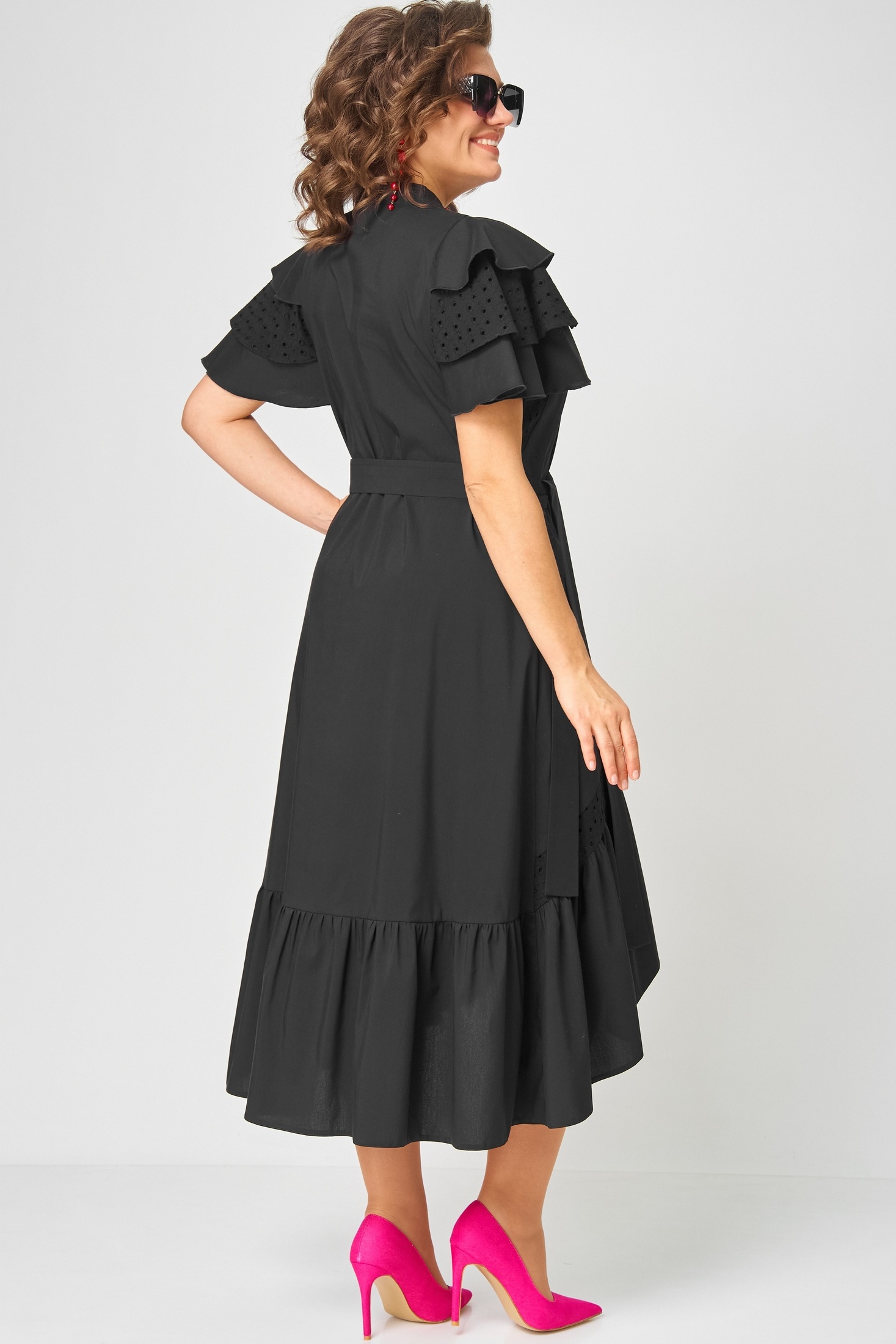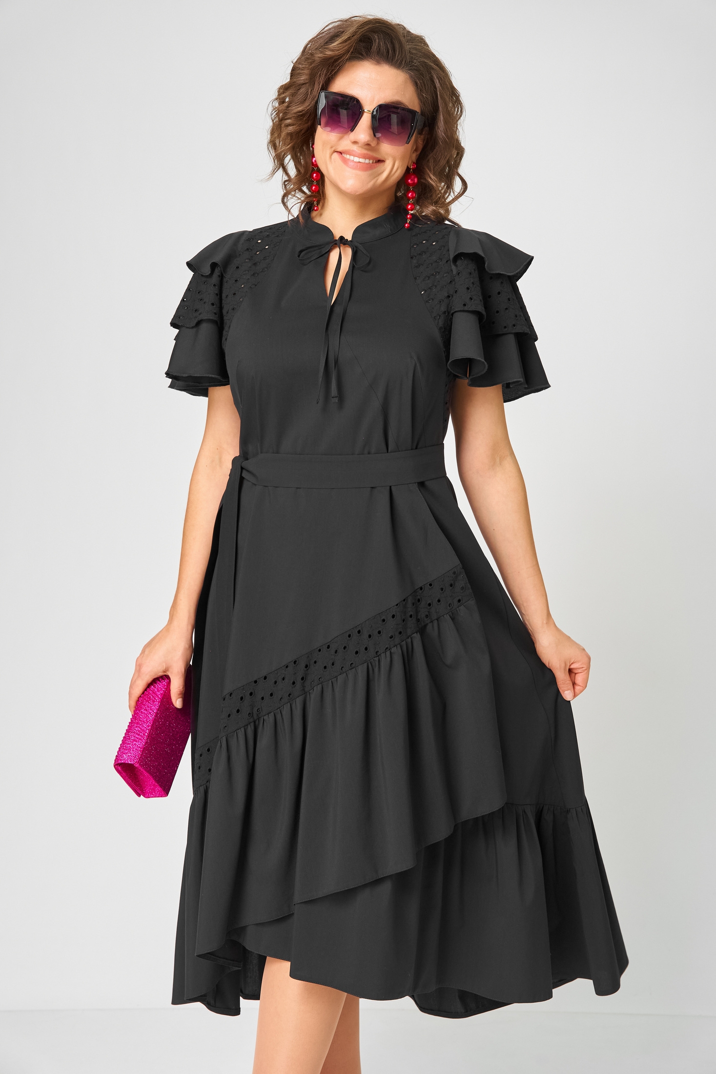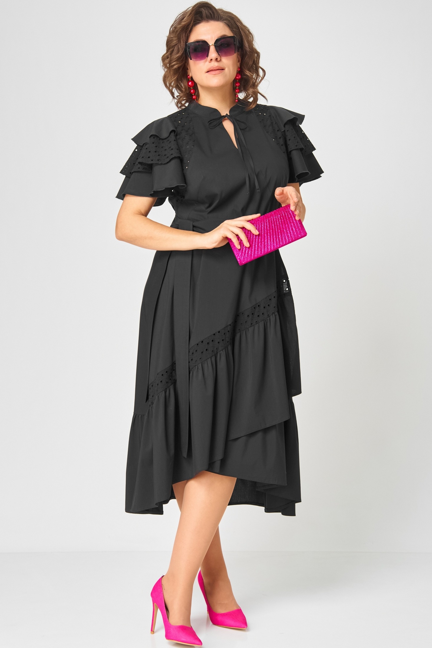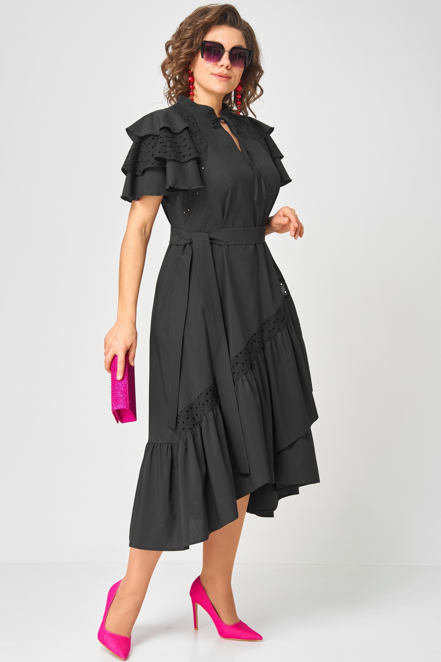 Платье женское нарядно-повседневное полуприлегающего силуэта расширенное к низу с ассиметричными воланами по боковм швам. Вырез горловины воротник на стойке рубашечного типа по центру с отделочным элементом и навесной петлей и пуговицей. Рукав втачной "Фэнтези" в виде крылышка. В боковх швах обработаны карманы. Декором платья служит пуговица отделочная со стразами и фигурные воланы по низу и боковым платья.