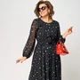 Платье женское нарядно-повседневное полуприлегающего силуэта расширенное к низу с ассиметричными воланами по боковым швам. Вырез горловины воротник на стойке рубашечного типа по центру с отделочным элементом и навесной петлей и пуговицей. Рукав втачной "Фэнтези" в виде крылышка. В боковх швах обработаны карманы. Декором платья служит пуговица отделочная со стразами и фигурные воланы по низу и боковым платья.